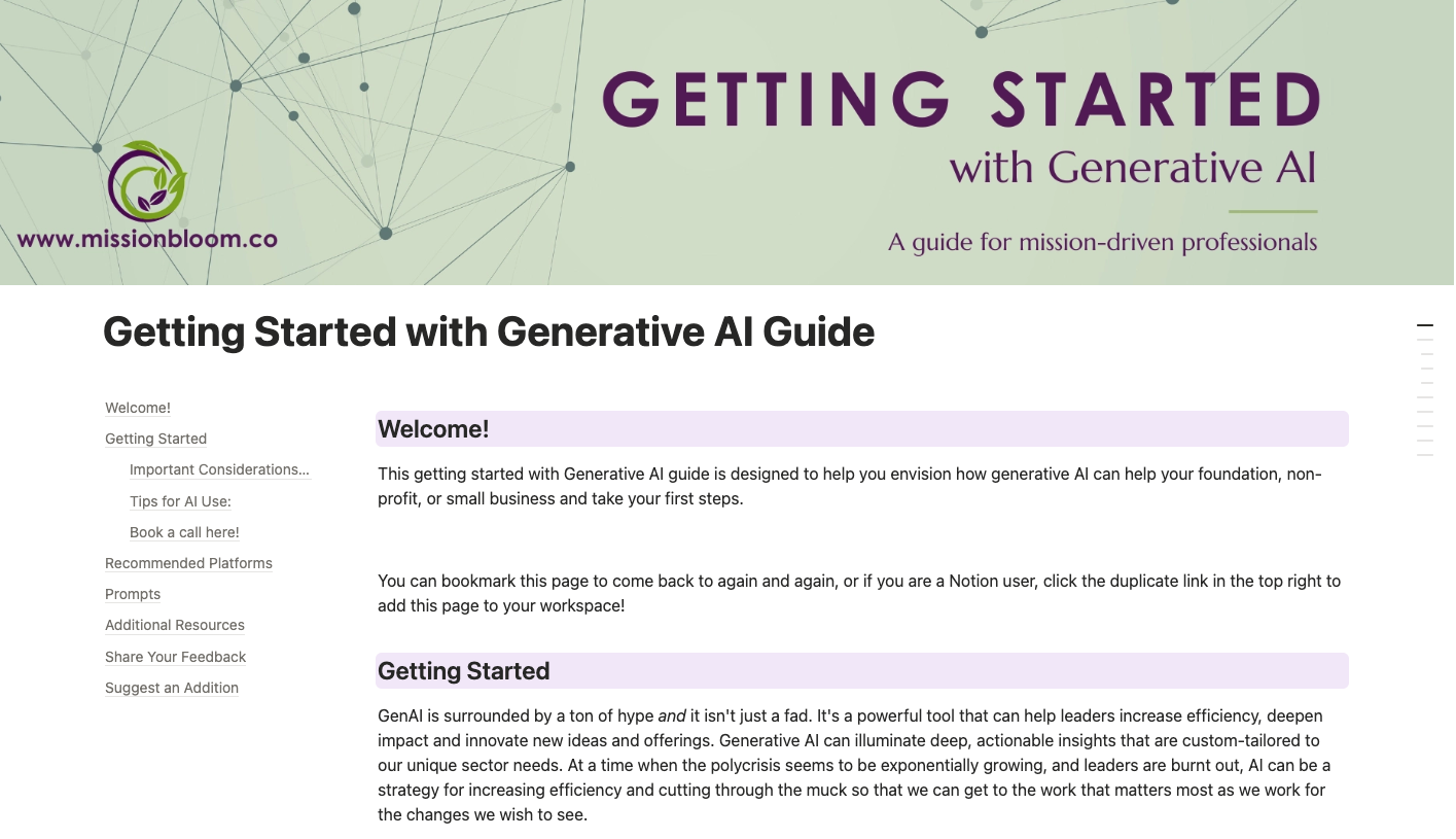 This getting started with Generative AI guide is designed to help you envision how generative AI can help your foundation, non-profit, or small business and take your first steps. It includes recommended platforms, prompts, and additional resources to get you started