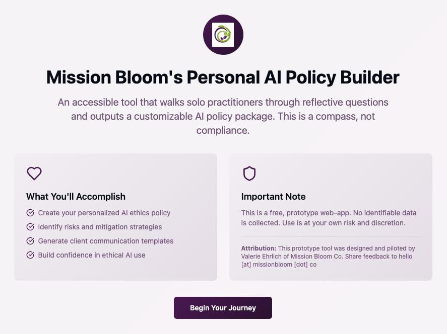 Draft your AI Ethics Personal Use Policy with the Mission Bloom Personal Policy Builder. This tool will walk you through questions and choices to create a personal compass for AI use that you can return to again and again.